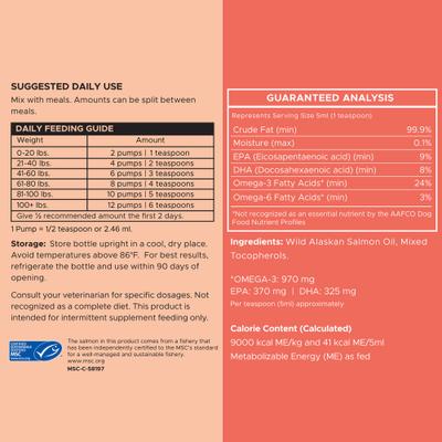 Suplemento para la piel y el pelaje de perros con aceite de salmón salvaje de Alaska puro certificado por el MSC (botella de 236 ml)