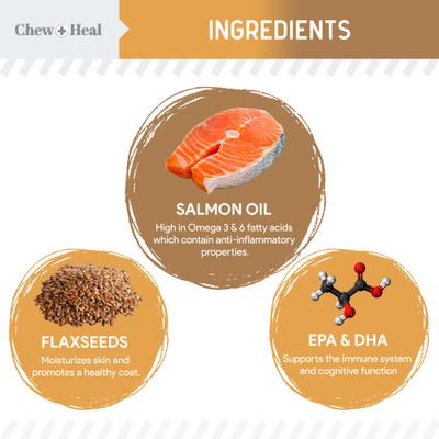 Treat your pup to a shiny and healthy coat with Chew + Heal Omega Skin + Coat 60 Original & 180 Peanut Butter Flavored Soft Chew Bundle Supplement for Dogs. Crafted with omega fatty acids from salmon, fish, and flaxseed oils, these chews promote good skin and coat health for your furry friend. Say goodbye to dandruff and itchy skin as these chews moisturize and nourish your pup’s skin. The omega-3 and -6 fatty acids support immunity and cognitive function, while calcium, phosphorus, vitamin E, and zinc aid in cell growth, nutrient absorption, and joint health. With ingredients like brewer’s yeast, B vitamins, biotin, EPA, and DHA, these chews also help reduce shedding, dirty appearance, and bald spots, keeping your pup show-ready at all times.