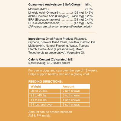 Inactive Ingredients: Dried Potato Product, Flaxseed, Glycerin, Brewers Dried Yeast, Lecithin, Salmon Oil, Maltodextrin, Natural Flavoring, Water, Tapioca Starch, Sorbic Acid (a Preservative), Mixed Tocopherols (a Preservative), Vegetable Oil.