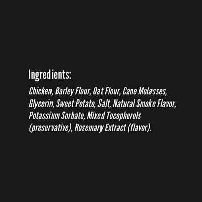 Pollo, harina de cebada, harina de avena, melaza de caña, glicerina, batata, sal, sabor ahumado natural, sorbato de potasio, tocoferoles mixtos, romero