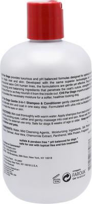 CHI Gentle 2-in-1 Shampoo & Conditioner simplifies your pup's bath experience to keep your dog looking and smelling clean. Shampoo washes while conditioner softens and tones your pet’s coat and skin. Made with mild surfactants, it will not irritate the eyes or skin of your furry friend. Keep bath time fun and easy with this one-step solution!