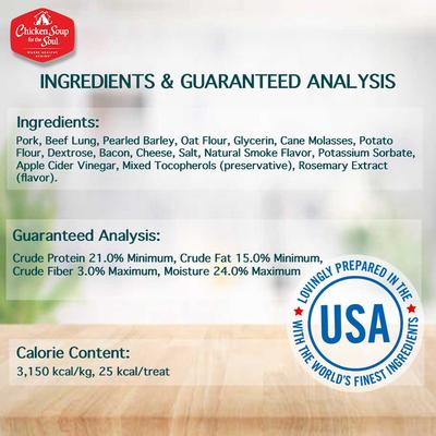 Pork, Beef Lung, Pearled Barley, Oat Flour, Glycerin, Cane Molasses, Potato Flour, Dextrose, Bacon, Cheese, Salt, Natural Smoke Flavor, Potassium Sorbate, Apple Cider Vinegar, Mixed Tocopherols (preservative), Rosemary Extract (flavor)