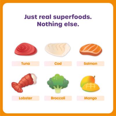 Water, Tuna, Cod, Tapioca Starch, Salmon, Lobster, Mango Powder, Broccoli, Vitamin B Complex (B1, B2, B3, B5,B6, B12, Folic Acid, Biotin), Vitamin E, Vitamin C, beLP1-D (Postbiotics).