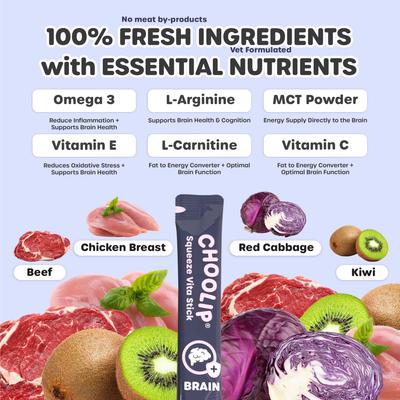 - Made with chicken breast, beef, red cabbage, and kiwi boosted with MCT powder, EPA/DHA, L-carnitine, L-arginine, and vitamins C and E to promote a healthy brain and circulation.
