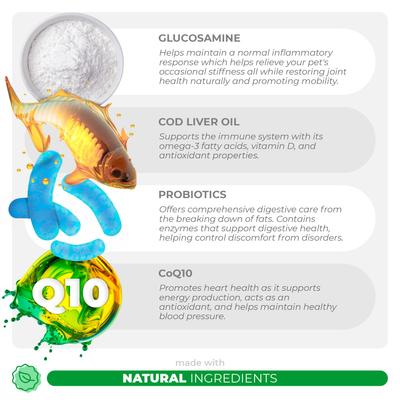 Active Ingredients: Glucosamine HCI (Shellfish Source), MSM (Methylsulfonylmethane), Chondroitin Sulfate (Porcine Source), Cod Liver Oil, Gut Health Blend: Enzyme Blend (Amylase, Protease, Lipase, Invertase, Cellulase), Bromelain (Ananas Comosus), Lactase, 5-Strain Probiotic Blend:L. acidophilus, L. reuteri, L. rhamnosus, L. salivarius, L. fermentum, Vitamin C, Vitamin B3, Potassium, Vitamin E, Coenzyme Q10, Vitamin B1, Zinc, Vitamin B5, Vitamin B6, Vitamin B2, Manganese, Vitamin B9, Vitamin A, Vitamin B7, Vitamin D, Vitamin B12.
