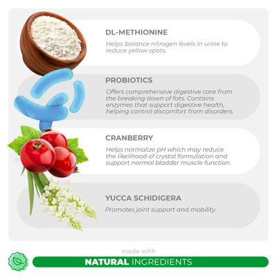 Active Ingredients: DL-Methionine, Canine Enzyme Blend (Amylase, Protease, LipaseCellulase, Lactase, Bromelain), Yucca Schidigera Extract, Apple Cider Vinegar, Cranberry, Brewer’s Yeast, Papaya, Total Microorganisms (Bacillus Coagulans).
