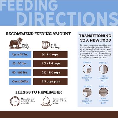 Adult Dogs – Food requirements will vary depending on breed, environment, temperature, and stress factors. Highly active, athletic dogs will require an additional amount of food depending on their level of activity. Food intake should be adjusted to maintain optimum body weight.
