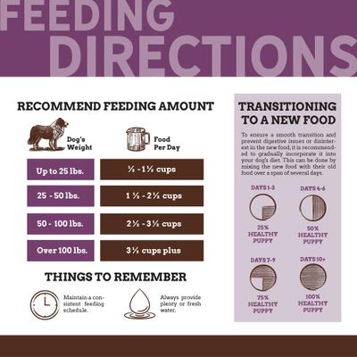 Highly Active, Athletic Adult Dogs – Food requirements will vary depending on breed, environment, temperature, and stress factors. Highly active, athletic dogs will require an additional amount of food depending on their level of activity. Food intake should be adjusted to maintain optimum body weight.