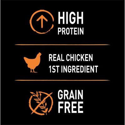 - La receta de alimento húmedo sin granos está hecha con pollo como ingrediente principal y 99% de proteína de origen animal.