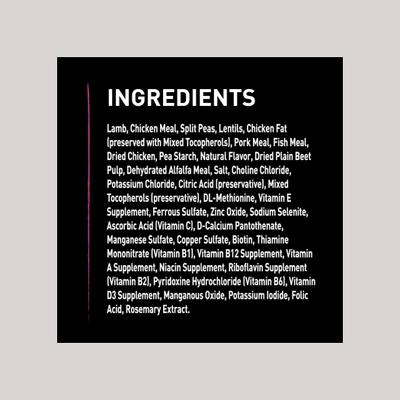 Lamb, Chicken Meal, Split Peas, Lentils, Chicken Fat (preserved with Mixed Tocopherols), Pork Meal, Fish Meal, Dried Chicken, Pea Starch, Natural Flavor, Dried Plain Beet Pulp, Dehydrated Alfalfa Meal, Salt, Choline Chloride, Potassium Chloride, Citric Acid (preservative), Mixed Tocopherols (preservative), DL-Methionine, Vitamin E Supplement, Ferrous Sulfate, Zinc Oxide, Sodium Selenite, Ascorbic Acid (Vitamin C), D-Calcium Pantothenate, Manganese Sulfate, Copper Sulfate, Biotin, Thiamine Mononitrate (Vitamin B1), Vitamin B12 Supplement, Vitamin A Supplement, Niacin Supplement, Riboflavin Supplement (Vitamin B2), Pyridoxine Hydrochloride (Vitamin B6), Vitamin D3 Supplement, Manganous Oxide, Potassium Iodide, Folic Acid, Rosemary Extract.