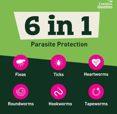 Credelio covers 6 types of parasites in one chewable tablet. It protects against ticks, fleas, heartworm disease and the three intestinal worms that can be passed to humans — tapeworms, roundworms and hookworms.