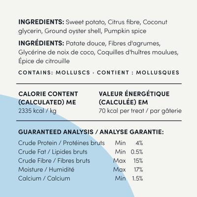- Made with limited ingredients including sweet potatoes, oyster shell flour, pumpkin spice and coconut oil.