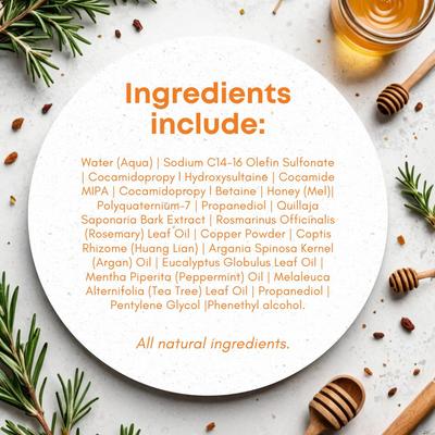 Water (Aqua) | Sodium C14-16 Olefin Sulfonate | Cocamidopropyl Hydroxysultaine |Cocamide Mipa | Cocamidopropyl Betaine | Honey (Mel)| Polyquaternium-7 |Propanediol | Quillaja Saponaria Bark Extract | Rosmarinus Officinalis (Rosemary) Leaf Oil | Copper Powder | Coptis Rhizome (Huang Lian) | Argania Spinosa Kernel (Argan) Oil | Eucalyptus Globulus Leaf Oil | Mentha Piperita (Peppermint) Oil | Melaleuca Alternifolia (Tea Tree) Leaf Oil | Propanediol | Pentylene Glycol |Phenethyl Alcohol.