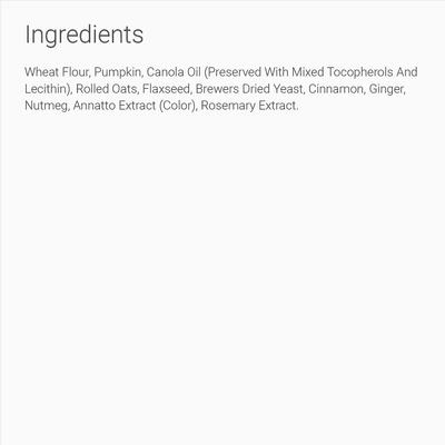 Wheat Flour, Pumpkin, Canola Oil (preserved with mixed tocopherols), Rolled Oats, Flaxseed, Cinnamon, Ginger, Annatto Extract (colour), Rosemary Extract.
