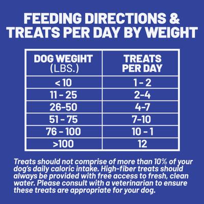 Treats should not comprise of more than 10% of your dog’s daily free caloric intake. High-fiber treats should always be provided with free access to fresh, clean water. Please consult with a veterinarian to ensure these treats are appropriate for your dog .Dogs weighing 10 pounds or less should receive 1-2 treat per day. Dogs 11-25 pounds should receive between 2-4 treats per day. Dogs weighing 26-50 pounds should receive between 4-7 treats per day. Dogs weighing 51-75 pounds should receive between 7-10 treats per day. Dogs weighing 76-100 pounds should receive between 10-11 treats per day. Dogs over 100 pounds should receive up to 12 treats per day.