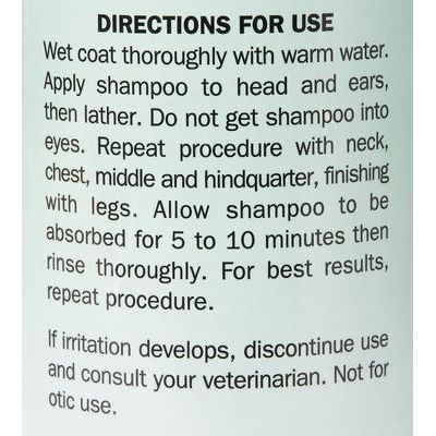 Moje bien el pelaje con agua tibia. Aplique el champú en la cabeza y las orejas y luego haga espuma. Evite el contacto con los ojos. Repita el procedimiento en el cuello, el pecho, el abdomen y los cuartos traseros, terminando con las patas. Deje que el champú se absorba de 5 a 10 minutos y luego enjuague bien. Para obtener mejores resultados, repita el procedimiento. Si se produce irritación, suspenda su uso y consulte a su veterinario.