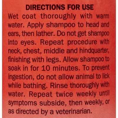 Moje bien el pelaje con agua tibia. Aplique el champú en la cabeza y las orejas y luego haga espuma. Evite el contacto con los ojos. Repita el procedimiento en el cuello, el pecho, el abdomen y los cuartos traseros, terminando con las patas. Deje que el champú actúe durante 10 minutos. Para evitar la ingestión, no permita que el animal se lama mientras lo baña. Enjuague bien con agua. Repita el tratamiento dos veces por semana hasta que los síntomas desaparezcan, luego semanalmente o según las indicaciones de un veterinario.