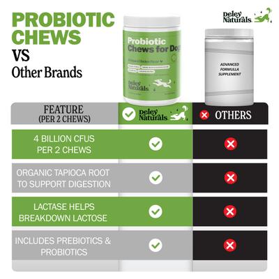 Supercharge your pooch’s digestion with Deley Naturals Advanced Probiotic Grain-Free Chicken Flavor Dog Supplement! They’re all natural, sourced, developed and produced in the USA without artificial colors or flavorings. Formulated to support proper digestive and gut health, these su-paw delicious soft chews use prebiotics and probiotics to promote vitamin, mineral and nutrient absorption. The probiotics feature a proprietary blend of six essential enzymes and 4 billion CFUs to relieve digestive issues and support a strong immune system. Your best pal is sure to love the irresistible chicken taste. You’ll love that there are no messy powders, measuring or hard-to-swallow pills, only delicious soft chews.