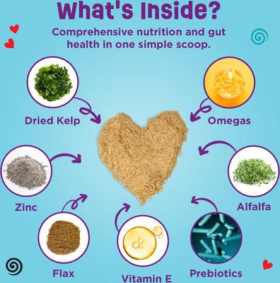 Ground Flax Seed, Dried Kelp, Yeast Culture, Dried Yeast, Vitamin E Supplement, Fructooligosaccharide, Zinc Methionine Complex, Yucca Schidigera Extract, Alfalfa Nutrient Concentrate, Bacillus Subtilis Fermentation Product Dehydrated, Bacillus Licheniformis Fermentation Product Dehydrated, Bacillus Pumilus Fermentation Product Dehydrated, Aspergillus Oryzae Fermentation Product Dehydrated, Aspergillus Niger Fermentation Product Dehydrated, Lactobacillus Acidophilus Fermentation Product Dehydrated-, Lactobacillus Casei Fermentation Product Dehydrated, Bifidobacterium Thermophilum Fermentation Product Dehydrated, Enterococcus Faecium Fermentation Product Dehydrated