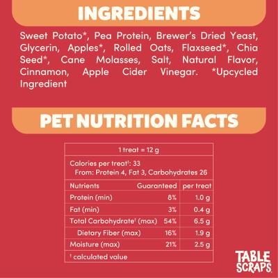 Sweet Potato, Pea Protein, Brewer's Dried Yeast, Glycerin, Apples, Rolled Oats, Flaxseed, Chia Seed, Cane Molasses, Salt, Natural Flavor, Cinnamon, Apple Cider Vinegar.