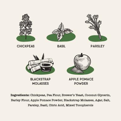 Chickpeas, Pea Flour, Brewer's Yeast, Coconut Glycerin, Coconut Oil, Barley Flour, Apple Pomace Powder, Blackstrap Molasses, Agar, Salt, Parsley, Basil, Citric Acid, Mixed Tocopherols.