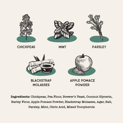 Garbanzos, harina de guisantes, levadura de cerveza, glicerina de coco, aceite de coco, mango, harina de cebada, polvo de pulpa de manzana, melaza negra, agar, sal, perejil, menta, ácido cítrico, mezcla de tocoferoles. Contenido calórico
