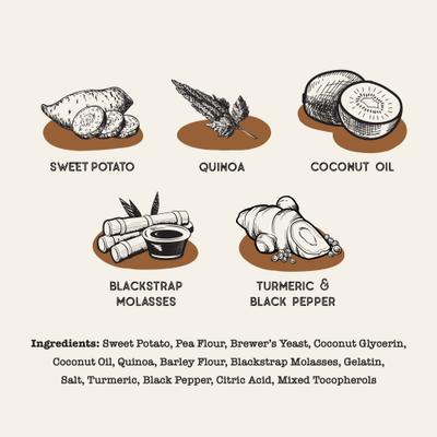 Sweet Potato, Pea Flour, Brewer’s Yeast, Coconut Glycerin, Coconut Oil, Quinoa, Barley Flour, Blackstrap Molasses, Agar, Salt, Turmeric, Black, Pepper, Citric Acid, Mixed Tocopherols.