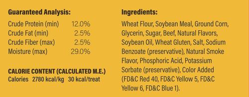 Wheat Flour, Soybean Meal, Ground Corn, Glycerin, Sugar, Beef, Natural Flavors, Soybean Oil, Wheat Gluten, Salt, Sodium Benzoate (preservative), Natural Smoke Flavor, Phosphoric Acid, PotassiumSorbate (preservative), Color Added (FD&C Red 40, FD&C Yellow 5, FD&C Yellow 6, FD&C Blue 1).