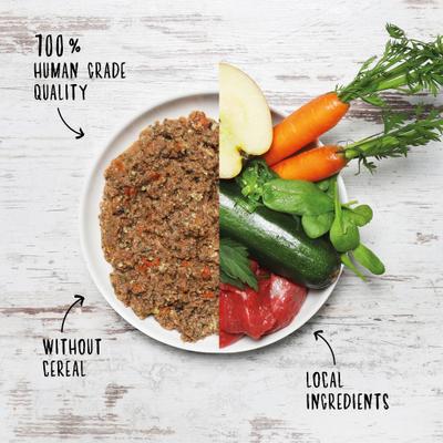 Beef 55% (beef meat 28%, beef heart 20%, beef liver 7%), carrot 11%, courgette 8%, leaf spinach 8%, apple 7%, potato starch, minerals, linseed oil, eggshell powder, seaweed, dandelion leaves, nettle leaves, calendula petals, watercress.