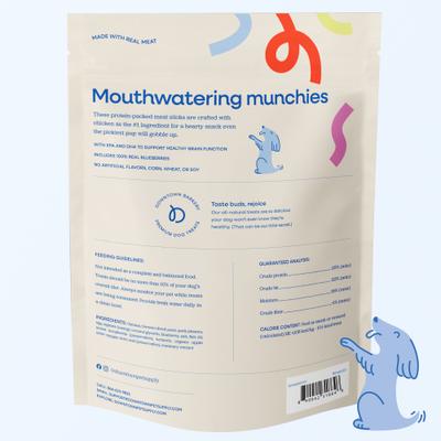Always supervise your dog while they're enjoying jerky sticks. Not intended as a complete and balanced food. Feed as snack or reward. Treats should be no more than 10% of your dog’s overall diet. Provide fresh water daily in a clean bowl.