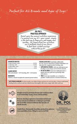 Handling and storing raw meat treats can be messy and complicated—but dogs prefer the taste of authentic meat above any other treat. Dr. Pol Salmon Munchies Grain-Free Freeze-Dried Raw Dog Treats are a great solution that allow you to feed your dog the delicious raw treats he craves, without all the hassle. These single-source protein salmon treats are high in protein and low in fat, which helps your pooch maintain optimal health and energy levels. Simply add as a meal topper, serve as a training treat or bring for an on-the-go snack.