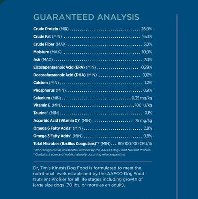 Dr. Tim's Kinesis Dog Food is formulated to meet the nutritional levels established by the AAFCO Dog Food Nutrient Profiles for all life stages including growth of large size dogs (70 lbs. or more as an adult).