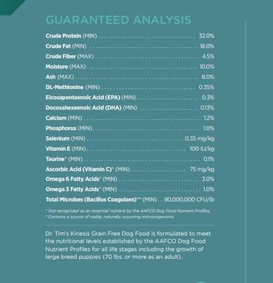Dr. Tim's Kinesis Grain Free Dog Food is formulated to meet the nutritional levels established by the AAFCO Dog Food Nutrient Profiles for all life stages except for growth of large size dogs (70 lbs. or more as an adult).