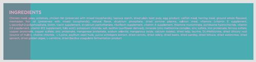 Chicken Meal, Peas, Potatoes, Chicken Fat (Preserved With Mixed Tocopherols), Tapioca Starch, Dried Plain Beet Pulp, Egg Product, Catfish Meal, Herring Meal, Ground Whole Flaxseed,Menhaden Fish Oil (Preserved With Mixed Tocopherols), Natural Flavor, Dicalcium Phosphate, Dried Porcine Plasma, Salmon Meal, Vitamins (Vitamin E Supplement,L-Ascorbyl-2-Polyphosphate, Biotin, Niacin Supplement, D-Calcium Pantothenate, Riboflavin Supplement, Vitamin A Supplement, Thiamine Mononitrate, Pyridoxine Hydrochloride, VitaminD3 Supplement, Vitamin B12 Supplement, Folic Acid), Potassium Chloride, Salt, Lecithin (Sunflower Derived), Minerals (Zinc Methionine Complex, Zinc Sulfate, Iron Proteinate, Ferrous Sulfate,Copper Proteinate, Copper Sulfate, Zinc Proteinate, Manganese Proteinate, Sodium Selenite, Manganous Oxide, Calcium Iodate), Dried Kelp, Taurine, Dl-Methionine, Dried Chicory Root(Source Of Inulin), Choline Chloride, L-Lysine, Psyllium Seed Husk, Yucca Schidigera Extract, Dried Carrots, Dried Celery, Dried Beets, Dried Parsley, Dried Lettuce, Dried Watercress, DriedSpinach, Dried Golden Algae, L-Carnitine, Dried Bacillus Coagulans Fermentation Product