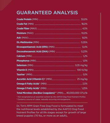 Dr. Tim's RPM Dog Food is formulated to meet the nutritional levels established by the AAFCO Dog Food Nutrient Profiles for all life stages except for growth of large size dogs (70 lbs. or more as an adult).