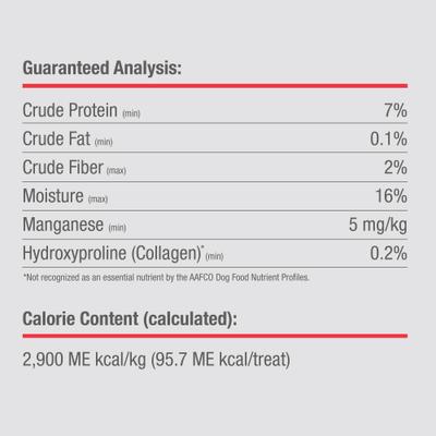 |Guaranteed Analysis|||---|---:||Crude Protein|7% min||Crude Fat|0.1% min||Crude Fiber|2% max||Moisture|16% max||Manganese|5 mg/kg min||Hydroxyproline (Collagen)|0.2% min|