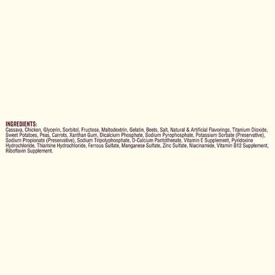Cassava, Chicken, Glycerin, Sorbitol, Fructose, Maltodextrin, Gelatin, Beets, Salt, Natural & Artificial Flavorings, Titanium Dioxide, Sweet Potatoes, Peas, Carrots, Xanthan Gum, Dicalcium Phosphate, Sodium Pyrophosphate, Potassium Sorbate (Preservative), Sodium Propionate (Preservative), Sodium Tripolyphosphate, D-Calcium Pantothenate, Vitamin E Supplement, Pyridoxine Hydrochloride, Thiamine Hydrochloride, Ferrous Sulfate, Manganese Sulfate, Zinc Sulfate, Niacinamide, Vitamin B12 Supplement, Riboflavin Supplement.