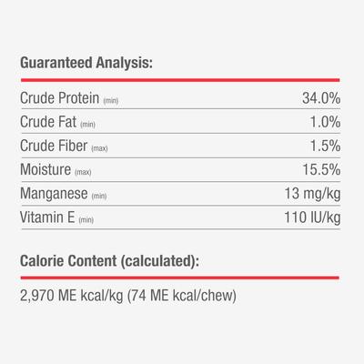 Select a treat slightly larger than your pet's mouth. This product is intended to be chewed. Always supervise your pet during chewing activity, especially if they are known to swallow their treats whole. Provide plenty of fresh drinking water and discard any leftover chunks or fragments. This product is intended for intermittent or supplemental feeding only. Treats should not exceed 10% of your dog's daily caloric intake. Visit your veterinarian regularly and discuss your pup's daily caloric requirements based on weight, size, breed, age, and activity level. If you have questions about whether this product is right for your dog, consult with your veterinarian.