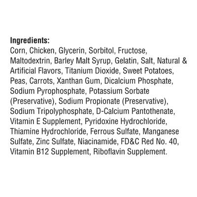 Corn, Chicken, Glycerin, Sorbitol, Furctose, Maltodextrin, Barley Malt Syrup, Gelatin, Salt, Natural & Artificial Flavors, Titanium Dioxide, Sweet Potatoes, Peas, Carrots, Xanthan Gum, Dicalcium Phosphate, Potassium Sorbate (Preservative), Sodium Propionate (Preservative), Sodium Tripolyphosphate, D-Calcium Pantothenate, Vitamin E Supplement, Pyridoxin Hydrochloride, Thiamine Hydrochloride, Ferrous Sulfate, Manganese Sulfate, Zinc Sulfate, Niacinamide, FD&C Red No 40, Vitamin B12 Supplement, Riboflavin Supplement.
