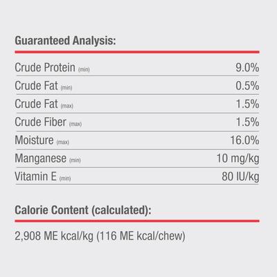 Select a treat slightly larger than your pet's mouth. This product is intended to be chewed. Always supervise your pet during chewing activity, especially if they are known to swallow their treats whole. Provide plenty of fresh drinking water and discard any leftover chunks or fragments. This product is intended for intermittent or supplemental feeding only. Treats should not exceed 10% of your dog's daily caloric intake. Visit your veterinarian regularly and discuss your pup's daily caloric requirements based on weight, size, breed, age and activity level. If you have questions about whether this product is right for your dog, consult with your veterinarian.