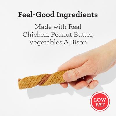 Rice Flour, Chicken, Corn Flour, Vegetable Glycerin, Wheat Flour, Peanut Butter, Potato, Calcium Carbonate, Bison, Cauliflower, Sweet Potato, Dried Cultured Whey, Cochineal Extract (Color), Caramel (Color), Vitamin E Supplement, Rosemary Extract, Manganese Sulfate.