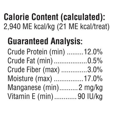 Almidón de maíz, pollo, glicerina, sorbitol, harina de guisantes, fructosa, maltodextrina, gleatina, jarabe de malta de cebada, sabores artificiales, sal, dióxido de titanio (colorante), zanahorias deshidratadas, boniato deshidratado, goma xantana, fosfato dicálcico, pirofosfato de sodio, sorbato de potasio (conservante), propionato de sodio (conservante), tripolifosfato de sodio, pantotenato de D-calcio, suplemento de vitamina E, sulfato ferroso, sulfato de manganeso, sulfato de zinc, clorhidrato de piridoxina, clorhidrato de tiamina, niacinamida, FD&C Rojo 40, suplemento de vitamina B12, suplemento de riboflavina.
