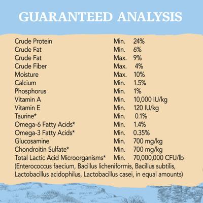 Pork Meal (source of Glucosamine), Barley, Brown Rice, Oat Groats, Rice, Peas, Chicken Meal (source of Chondroitin Sulfate), Dried Plain Beet Pulp, Chicken Fat, Flaxseed, Potassium Chloride, Dried Chicory Root, Taurine, Vitamin E Supplement, Mixed Tocopherols added to preserve freshness, Niacin, Zinc Proteinate, Ferrous Sulfate, Zinc Sulfate, Vitamin A Supplement, Iron Proteinate, Ascorbic Acid (Vitamin C), Thiamine Mononitrate, d-Calcium Pantothenate, Sodium Selenite, Pyridoxine Hydrochloride, Copper Sulfate, Manganese Sulfate, Riboflavin, Manganese Proteinate, Copper Proteinate, Biotin, Vitamin D3 Supplement, Vitamin B12 Supplement, Folic Acid, Calcium Iodate, Dried Enterococcus faecium Fermentation Product, Dried Bacillus licheniformis Fermentation Product, Dried Bacillus subtilis Fermentation Product, Rosemary Extract, Green Tea Extract, Spearmint Extract.
