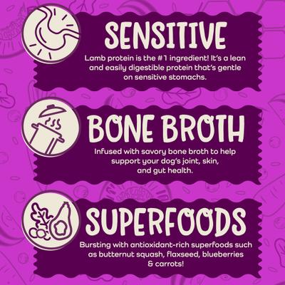 - Made with lamb protein, which is an easily digestible protein and gentle on sensitive stomachs.