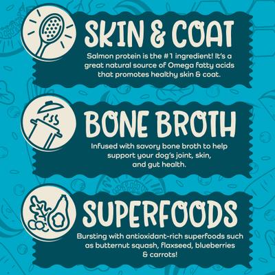 - Infused with savory bone broth to support your canine companion’s gut, joints and skin.