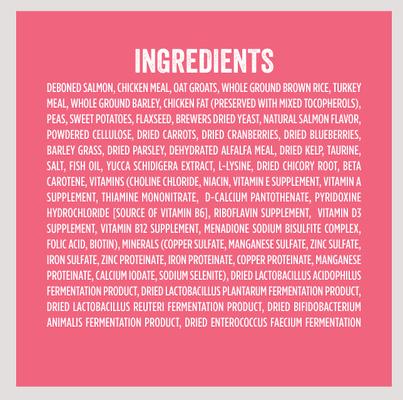 Deboned Salmon, Chicken Meal, Oatmeal, Whole Ground Brown Rice, Turkey Meal, Whole Ground Barley, Chicken Fat (Preserved With Mixed Tocopherols), Peas, Potatoes, Whole Sweet Potatoes, Natural Salmon Flavor, Powdered Cellulose, Dried Carrots, Dried Cranberries, Dried Blueberries, Flaxseed Meal, Barley Grass, Dried Parsley, Alfalfa Meal, Dried Kelp, Taurine, Salt, Fish Oil, Yucca Schidigera Extract, L-Lysine, Dried Chicory Root, Beta Carotene, Vitamins (Choline Chloride, Vitamin E Supplement, Vitamin A Supplement, Vitamin D3 Supplement, Calcium Pantothenate, Thiamine Mononitrate, Pyridoxine Hydrochloride, Riboflavin Supplement, Niacin, Folic Acid, Biotin, Vitamin B12 Supplement), Minerals (Iron Amino Acid Chelate, Zinc Amino Acid Chelate, Manganese Amino Acid Chelate, Copper Amino Acid Chelate, Sodium Selenite, Calcium Iodate, Potassium Chloride, Calcium Carbonate, Zinc Sulfate), Dried Lactobacillus Acidophilus Fermentation Product, Dried Lactobacillus Plantarum Fermentation Product, Dried Lactobacillus Reuteri Fermentation Product, Dried Bifidobacterium Animalis Fermentation Product, Dried Enterococcus Faecium Fermentation Product.