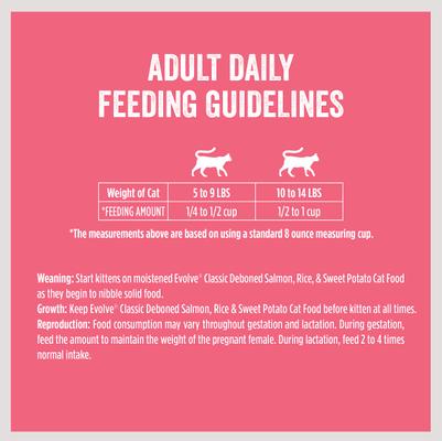 Feed your kitty the balanced nutrition of the Evolve Classic Deboned Salmon, Rice & Sweet Potato Formula Dry Cat Food. Made with real salmon as the first ingredient along with wholesome brown rice and tasty foods like sweet potatoes, kelp, blueberries and more, it packs everyday nourishment and lip-smacking flavor in every bite. It’s loaded with vitamins, minerals and antioxidants to support immunity, probiotics for gentle digestion, plus omegas, taurine and essential amino acids for all the nutrients your pal needs to look and feel his best. Plus, it has zero wheat, corn or soy so it’s great for kitties with allergies or food intolerances.
