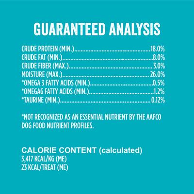 Duck, Garbanzo Beans, Peas, Sweet Potatoes, Chicken Meal, Glycerin (Derived From Vegetable Oil), Sugar, Ground Flaxseed, Brewers Dried Yeast, Tapioca Starch, Pea Starch, Chicken Fat (Preserved With Mixed Tocopherols), Cane Molasses, Dried Blueberries, Salt, Potassium Chloride, Phosphoric Acid, Gelatin, Sorbic Acid (A Preservative), Zinc Propionate (A Preservative), Natural Smoke Flavor, Dried Cultured Skim Milk, Vitamin E Supplement, Dried Cranberries, Pomegranate, Chicory Root, Kelp, Pumpkin, Dried Apples, Dried Carrots, Broccoli, Parsley, Papaya, Spinach, Kale Powder, Minerals (Zinc Sulfate, Copper Sulfate, Manganese Sulfate, Calcium Iodate, Sodium Selenite), Rosemary Extract.