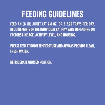 Feed an (8 lb) adult cat 7-8 oz. or 2-2.25 trays per day. Requirements of the individual cat may vary depending on factors like age, activity level and housing. Please feed at room temperature and always provide clean, fresh water and refrigerate leftovers.