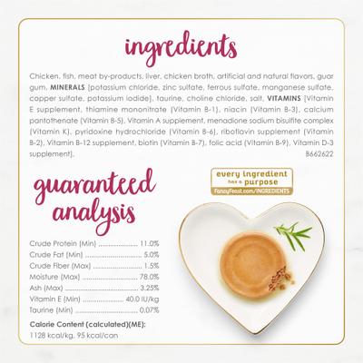 Chicken, Fish, Meat By-products, Liver, Chicken Broth, Artificial And Natural Flavors, Guar Gum, MINERALS [Potassium Chloride, Zinc Sulfate, Ferrous Sulfate, Manganese Sulfate, Copper Sulfate, Potassium Iodide], Taurine, Choline Chloride, Salt, VITAMINS [Vitamin E Supplement, Thiamine Mononitrate (Vitamin B-1), Niacin (Vitamin B-3), Calcium Pantothenate (Vitamin B-5), Vitamin A Supplement, Menadione Sodium Bisulfite Complex (Vitamin K), Pyridoxine Hydrochloride (Vitamin B-6), Riboflavin Supplement (Vitamin B-2), Vitamin B-12 Supplement, Biotin (Vitamin B-7), Folic Acid (Vitamin B-9), Vitamin D-3 Supplement]. B662622